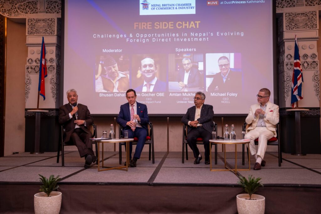 A key highlight of the event was the Fireside Chat on “Challenges & Opportunities in Nepal’s Evolving Foreign Direct Investment”, featuring an esteemed panel comprising Mr. Michael Foley (CEO, Ncell), Mr. Tim Gocher OBE (Founder & CEO, Dolma Impact Fund), and Mr. Amlan Mukherjee (CEO & MD, Unilever Nepal Ltd.). The session was moderated by renowned media personality Mr. Bhusan Dahal and offered valuable insights into Nepal’s investment landscape, policy environment, and future prospects.